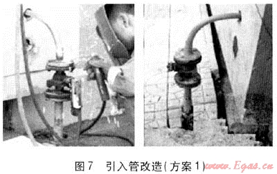 ② 將原有變形管道切割,焊接金屬波紋軟管,見圖7左。
