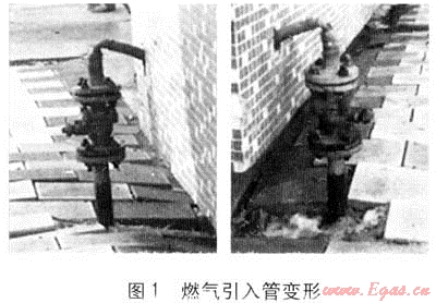 由于土壤荷載分布不均勻而產(chǎn)生建筑物的不均勻沉降,從而導(dǎo)致燃?xì)庖牍馨l(fā)生位移或變形,危及燃?xì)夤艿赖陌踩?,?yīng)引起高度重視,采取有效措施加以防范[3~6]。大慶市東、西兩城區(qū)城市燃?xì)馔ピ汗艿啦糠治挥诟咚粎^(qū)域,冬季土壤的凍脹加劇了建筑物下部土壤荷載分布的不均勻程度,造成持力層地基土的附加應(yīng)力不均勻,從而造成土體總壓縮變形的不均勻,突出表現(xiàn)為建筑物基礎(chǔ)附近的不均勻沉降,由此造成燃?xì)庖牍馨l(fā)生位移或變形,見圖1。