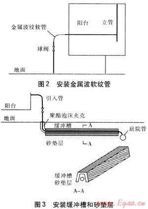 考慮到引入管受力來源于地面土壤,先在引入管底部增加砂墊層,然后將入地處至庭院管間的管道包裹聚氨酯泡沫夾克,最后在管道頂部加蓋緩沖槽,具體做法見圖3。