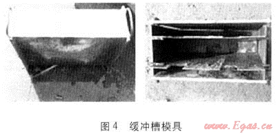 a. 使用緩沖槽模具(見圖4),將水、水泥、砂子、石子按照體積比為0.6:1:2:4的配比澆筑混凝土緩沖槽(見圖5)若干。