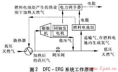 近年來(lái),美國(guó)、英國(guó)一些公司將膨脹機(jī)技術(shù)與其他技術(shù)聯(lián)合,以回收調(diào)壓過(guò)程中的壓力能,研究工作取得了一定進(jìn)展。2008年10月,北美Enbridge公司將膨脹機(jī)與燃料電池組合在一起形成DFC-ERG系統(tǒng)[6],并在加拿大多倫多門站進(jìn)行了現(xiàn)場(chǎng)試驗(yàn),該聯(lián)合裝置的發(fā)電功率為2200kW。DFC-ERG系統(tǒng)工作原理見圖2。