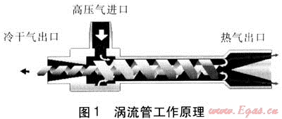 以只輸入一定壓力的壓縮空氣為例,通過(guò)渦流管處理,一端產(chǎn)生冷空氣(在干燥空氣的前提下最低溫度可達(dá)-46℃),另一端產(chǎn)生熱空氣(最高溫度可達(dá)127℃)。利用冷、熱端氣體溫度的不同,可分別提供制冷或加熱,使能量得到充分利用。渦流管制冷效果介于節(jié)流閥和膨脹機(jī)之間。