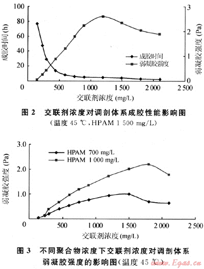 由圖2、圖3可見(jiàn),聚合物濃度一定時(shí),交聯(lián)劑濃度增加,體系成膠時(shí)間縮短,形成的弱凝膠強(qiáng)度增加,這是因?yàn)榻宦?lián)劑濃度增加,聚合物交聯(lián)機(jī)會(huì)及弱凝膠分子間交聯(lián)密度增加所致。但交聯(lián)劑濃度過(guò)高時(shí),體系形成的弱凝膠反而有所降低,長(zhǎng)期放置觀測(cè)發(fā)現(xiàn)弱凝膠不穩(wěn)定,有輕微脫水現(xiàn)象。這是因?yàn)榻宦?lián)劑濃度過(guò)高,體系反應(yīng)形成凝膠后,溶液內(nèi)部的活性基團(tuán)與交聯(lián)劑之間的化學(xué)反應(yīng)仍在進(jìn)行,這會(huì)使凝膠的交聯(lián)點(diǎn)增加,交聯(lián)密度增大導(dǎo)致凝膠的分子線團(tuán)發(fā)生收縮,從而出現(xiàn)脫水和破膠現(xiàn)象。同時(shí)交聯(lián)劑濃度太小時(shí),體系交聯(lián)不充分或不能有效地進(jìn)行交聯(lián),形成的凝膠太弱或不能形成整體凝膠,用于調(diào)剖難以形成有效的堵塞。此外聚合物濃度越高,形成穩(wěn)定弱凝膠要求的交聯(lián)劑也相應(yīng)增加。用于裂縫凝析氣藏調(diào)剖作業(yè)的弱凝膠,一般要求弱凝膠強(qiáng)度稍高,在1Pa以上。HPAM在1000mg/L以上,調(diào)剖劑最佳交聯(lián)劑濃度確定在450~900mg/L,該調(diào)剖體系形成的弱凝膠穩(wěn)定,弱凝膠在地層中可移動(dòng),從而達(dá)到調(diào)剖目的。