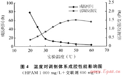 溫度是交聯(lián)化學(xué)反應(yīng)最敏感因素之一,尤其是對(duì)成膠時(shí)間的影響。在HPAM YG103弱凝膠交聯(lián)反應(yīng)中,過(guò)高的溫度會(huì)使弱凝膠破膠水化,筆者考察了30~50℃條件下調(diào)剖劑體系成膠性能的影響。實(shí)驗(yàn)中固定交聯(lián)體系配方,將體系溶液分別置于不同溫度的水浴中,定期觀測(cè)交聯(lián)體系的成膠時(shí)間及形成弱凝膠的強(qiáng)度。實(shí)驗(yàn)結(jié)果見(jiàn)圖4。
