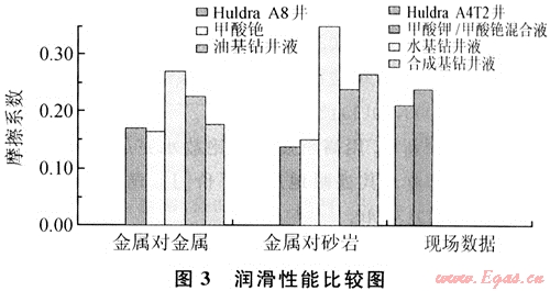 鉆井液的潤滑性已成為一個日益重要的因素。從實驗研究結(jié)果(圖3)可看出,甲酸鹽鉆井液具有很好的潤滑性。