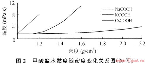 甲酸鈉、甲酸鉀、甲酸銫這3種鹽水的黏度隨密度的變化關(guān)系[2]如圖2所示。