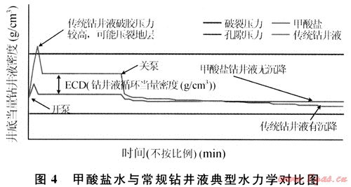 甲酸鹽鉆井液最大限度地降低了開泵時的瞬時峰壓、起下鉆時的抽汲激動壓力和循環(huán)壓力損失。Huldra A4井和A4ST井的循環(huán)當量密度比較見表5,甲酸鹽水鉆井液與常規(guī)鉆井液典型水力學(xué)對比(圖4)。