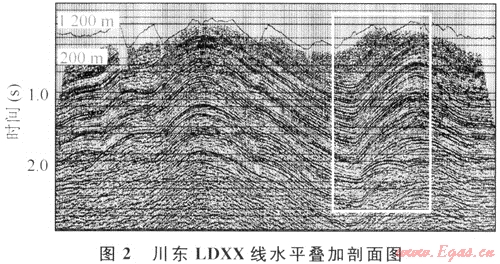 圖2為四川盆地東部某地區(qū)LDXX線水平疊加剖面,剖面上方為地表高程曲線??梢钥闯觯涸摐y線地表起伏劇烈,海拔高程在280~1180m之間,部分地段地形切割厲害,橫向100m范圍內(nèi)高程差達800m。從水平疊加剖面能看到,資料信噪比較高,但地覆構(gòu)造比較復(fù)雜,各種地震波發(fā)育。根據(jù)以往的地震地質(zhì)經(jīng)驗及鉆井分析,該地區(qū)速度橫向變化不大,完全滿足疊前時間偏移條件,使用疊前時間偏移技術(shù),能較好地使繞射歸位,提高資料橫向分辨率,較準確地落實地腹構(gòu)造形態(tài)。