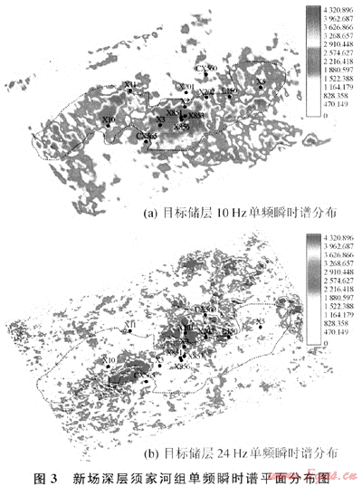 圖3所示是新場地區(qū)深層須家河組單頻瞬時譜平面分布情況,其顯示的瞬時譜具有十分明顯的差異。在圖3-a中,低頻強瞬時譜區(qū)域(紅色)包括了所有天然氣高產(chǎn)工業(yè)井,低產(chǎn)井分布在低頻弱瞬時譜區(qū)域(淺藍(lán)色),水井分布區(qū)域低頻瞬時譜更弱(白色)。在圖3-b中的多邊形框內(nèi),高頻強瞬時譜是泥巖響應(yīng),而高頻弱瞬時譜是有效砂巖儲層響應(yīng)。雖然,含氣儲層和含水儲層在高頻段有相似的響應(yīng)特征,但是,結(jié)合已知井信息,將圖3-a與圖3-b進行仔細(xì)對比,就可以發(fā)現(xiàn)含氣儲層和含水儲層具有不同的時頻響應(yīng)規(guī)律。
