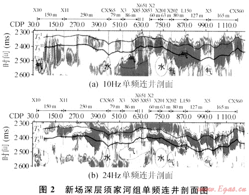 摘要:四川盆地川西坳陷深層上三疊統(tǒng)須家河組的X851井、X856井、X2井、X3井、X1O井等一批高產(chǎn)氣井證實了該區(qū)具有巨大的勘探開發(fā)潛力。然而,CX565、X201等高產(chǎn)水井的出現(xiàn)也為該區(qū)成功部署井位增添了不確定因素,因此,對該區(qū)須家河組儲層氣水判別就顯得尤為重要。地震波在須家河組的含氣儲層和含水儲層中傳播時,在時間域內(nèi)難以發(fā)現(xiàn)振幅、頻率和能量等動力學(xué)屬性的變化差異。采用時頻分析技術(shù)將時間域的地震信號變換到時間-頻率域進行對比分析解釋,發(fā)現(xiàn)“低頻陰影”、“高頻衰減”等現(xiàn)象在含氣儲層中十分突出,而在含水儲層中卻不存在。利用時頻域內(nèi)的這些典型特征建立模式,并對該區(qū)含氣儲層和含水儲層進行了有效的區(qū)分,其結(jié)果與鉆、測井資料吻合良好。