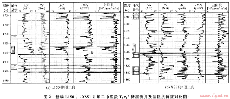 X856、X2井在T3x24層測(cè)試獲日產(chǎn)50×104m3以上高產(chǎn)工業(yè)氣流,為典型高產(chǎn)井,這樣的產(chǎn)能在陸相碎屑巖氣藏中亦較為少見,該類高產(chǎn)井優(yōu)質(zhì)儲(chǔ)層厚度大(20~30m),孔隙度高(一般大于4%),通過(guò)錄井次生礦物識(shí)別、成像測(cè)井解釋等證實(shí)裂縫極為發(fā)育,規(guī)模裂縫網(wǎng)絡(luò)及相對(duì)厚層優(yōu)質(zhì)儲(chǔ)層發(fā)育,為典型高效儲(chǔ)滲體特征。儲(chǔ)層具有Ⅱ類中等波阻抗特征,由于儲(chǔ)層與圍巖阻抗接近,波阻抗差小,地震反射強(qiáng)度較弱,利用合成地震記錄對(duì)X856、X2井須二段開展儲(chǔ)層精細(xì)標(biāo)定,產(chǎn)層T3x24對(duì)應(yīng)空白弱反射。L150井、X853井為2口低產(chǎn)井,日產(chǎn)氣量均在5×104m3左右,儲(chǔ)層為典型的工類高阻抗儲(chǔ)層,該類井往往優(yōu)質(zhì)儲(chǔ)層厚度相對(duì)較薄(不超過(guò)10m),且裂縫網(wǎng)絡(luò)欠發(fā)育,儲(chǔ)層與上覆低阻抗泥巖波阻抗差異大,地震剖面對(duì)應(yīng)中強(qiáng)振幅,儲(chǔ)層頂界對(duì)應(yīng)強(qiáng)波峰,大部分須二段儲(chǔ)層及超致密砂巖均具有此類特征。