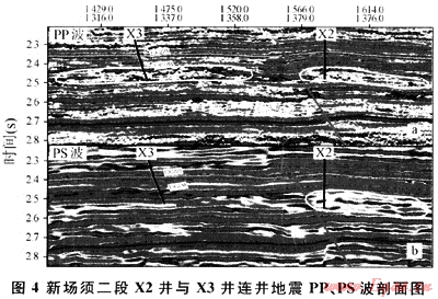 PP波暗點(diǎn)+PS波非暗點(diǎn)類型(單弱):存在較大型裂縫網(wǎng)絡(luò)或天然氣儲(chǔ)滲體,裂縫網(wǎng)絡(luò)未明顯影響巖石骨架穩(wěn)定成像。該類型以獲得初產(chǎn)23×104m3/d,穩(wěn)產(chǎn)約10×104m3/d的X3井為典型代表,該類為次優(yōu)組合。該區(qū)域勘探開發(fā)獲中高產(chǎn)能可能性較大。