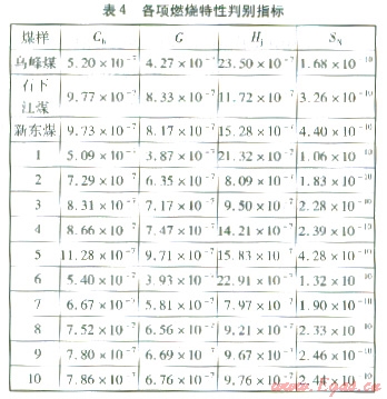 可燃性指數(shù)Cb主要反映煤樣燃燒前期的反應(yīng)能力,該值越大,表明可燃性越好。各煤樣的可燃性指數(shù)Cb見表4。由表4可知,單煤樣中,石下江煤、新東煤的可燃性較好,烏峰煤的可燃性較差?;烀旱目扇夹曰窘橛趦煞N單煤的可燃性之間,且隨著某種單煤比例的增加,混煤的可燃性指數(shù)Cb逐漸向該煤種靠近。烏峰煤與石下江煤按2:8摻混時,混煤的可燃性明顯變好。