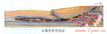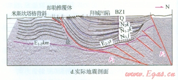 從實際地震剖面與物理模擬的結果對比圖(圖3-b、c)來看,該實驗基本將阿瓦特段的構造變形情況真實地再現(xiàn)了出來,物理模擬的構造形態(tài)與地震剖面基本一致:鹽下發(fā)育4排疊瓦逆沖斷層,與地震剖面一致;物理模擬剖面斷層傾角約30°,地震剖面斷層傾角40°,二者基本吻合。該實驗在邊界條件的設計上和構造變形的過程上與真實情況基本一致,符合相似性原則,可以作為對該地區(qū)構造解釋的有效證據(jù)。