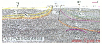 在鹽的滑脫作用下,鹽上層變形與鹽下層變形不協(xié)調。鹽上層主要表現(xiàn)為幅度很小的向斜盆地和推覆距離很大的逆沖推覆體,鹽下前緣斷層在擠壓作用下即開始形成,直至擠壓最終結束,始終在活動。而鹽上負載則在鹽的滑脫作用下推覆至鹽盆地南邊的硬性地層之上,并由于鹽的聚集作用和基底的抬升作用,鹽上