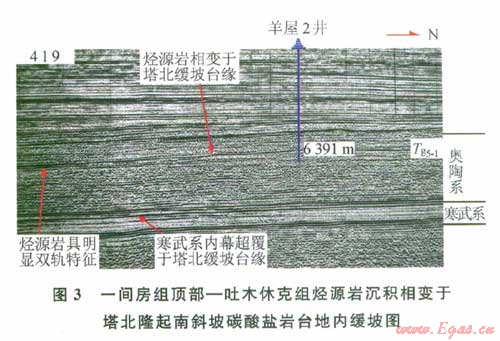 但是,通過對經過羊屋2井地震剖面(測線419)的精細分析(圖3),發(fā)現在羊屋2井南部3 km處存在同相軸Tg5-1及其下面的“雙軌”變“單軌”的巖性相變反射,即代表著上奧陶統良里塔格組石灰?guī)r頂面Tg5-1之下的強反射軸發(fā)生相變。同時經多條地震剖面相互閉合、連接確認,此發(fā)生相變的“雙軌”同相軸與過塔中29井烴源巖發(fā)育位置的強相位反射顯示的是同一套地層發(fā)射。據此認為,中上奧陶統一間房組頂部—吐木休克組烴源巖沉積相變于塔北隆起南斜坡羊屋2井南3 km處的碳酸鹽巖臺地內緩坡。