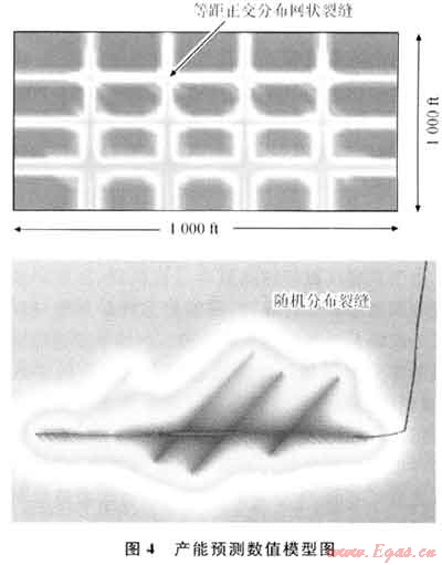 Bruce等[8]建立了線網(wǎng)模型,采用正交的橢球面模擬網(wǎng)狀裂縫面,裂縫在空間上呈三維分布互相正交;考慮了穩(wěn)態(tài)和擬穩(wěn)態(tài)流動(dòng)的情況,計(jì)算出了產(chǎn)能預(yù)測(cè)圖版。Cipolla等[9]建立了等距分布正交分布的網(wǎng)狀裂縫產(chǎn)能預(yù)測(cè)模型,采用SRV方法計(jì)算改造體積。模擬計(jì)算中考慮了支撐劑的分布形態(tài)(支撐裂縫和未支撐裂縫),滲流模式(解吸附、達(dá)西滲流和非達(dá)西滲流)以及裂縫參數(shù)對(duì)產(chǎn)能的影響。Williams等[10]通過(guò)裂縫識(shí)別技術(shù)確認(rèn)裂縫面和裂縫數(shù)量;結(jié)合成像測(cè)井確定的裂縫方位,建立裂縫分布模型后簡(jiǎn)化為氣藏?cái)?shù)值模擬模型,通過(guò)歷史擬合進(jìn)行模型校正和參數(shù)優(yōu)化。
