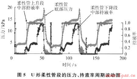 圖5是氣、液相折算速度都為0.30m/s時U形柔性管的壓力、持液率周期波動圖。在液塞形成階段液塞頭進入U形柔性管之前,U形柔性管內(nèi)少量液體振蕩流動,U形柔性管底部壓力較小并有小幅度的波動。液塞進入U形柔性管后,U形柔性管下降段中部持液率先開始上升,由于下降段傾角較大,液體在下降段為分層流,U形柔性管下降段中部持液率值較小。隨著液塞頭在上升段中生長,U形柔性管底部壓力開始增大,當?shù)竭_上升管探針處時,U形柔性管上升段中部持液率從0變?yōu)?。在液塞生產(chǎn)階段,U形柔性管底部壓力與U形柔性管上升段中部持液率不再增長。隨著液塞不斷流入U形柔性管,U形柔性管上升段中部持液率慢慢增大。在液氣噴發(fā)階段,由于液塞加速,U形柔性管底部壓力先迅速增大然后迅速減小到最小值,U形柔性管上升段中部持液率迅速增大到1。隨著液塞尾經(jīng)過U形柔性管,液體回落,U形柔性管上升段中部持液率和u形柔性管上升段中部持液率迅速減小直至重新變?yōu)?,開始下一個嚴重段塞流周期。