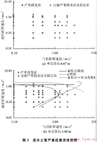 筆者將混合立管液塞長度達到或超過整個立管長度的段塞流劃為嚴重段塞流;將液塞長度小于立管長度但是有液塞堵塞立管底部的段塞流劃為過渡嚴重段塞流;將水力學段塞流、氣泡流、氣團流和環(huán)狀流劃為穩(wěn)定流。圖2-a、2-b為下傾管傾角為-2°、立管總高度為7.00m、U形柔性管長度為2.20m、水平跨度為1.50m,垂直管高度分別為6.67m和6.00m的混合立管嚴重段塞流流型圖。從圖2可以看出,混合立管嚴重段塞流發(fā)生在氣液相流量都較小的工況下。對比圖2-a和圖2-b,發(fā)現(xiàn)嚴重段塞流的范圍相差很小,垂直管高度為6.67m的混合立管嚴重段塞流范圍要稍大一點。