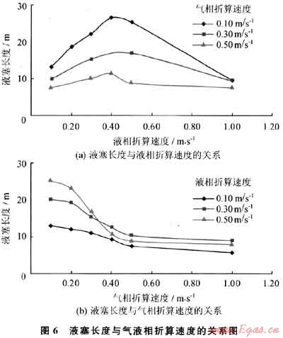 液塞長度隨著氣相折算速度的增加而減小。當液相折算速度恒定時,隨著氣相折算速度的增加,嚴重段塞流周期變小,流入立管的液體減少,因而液塞長度減小。同樣,圖2所示的流型圖也反應了這種現(xiàn)象。