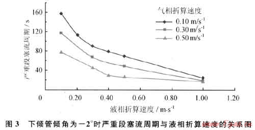 圖3為下傾管傾角為-2°時嚴重段塞流周期與液相折算速度的關系圖。從圖3可以看出嚴重段塞流周期隨液相折算速度的增大而減小。實驗顯示形成嚴重段塞流時下傾管為分層流。液相折算速度增大時,下傾管持液率增加,氣相空間相應減小,相同時間內(nèi)氣相壓力增加值變大,因此嚴重段塞流周期變短。同時從圖3還可以看出嚴重段塞流周期隨氣相折算速度的增大而減小,當氣相折算速度增加時,下傾管內(nèi)的氣體壓力上升速度增加,下傾管內(nèi)的氣相壓力值達到立管底部所受最大靜水壓力的時間變短,因此嚴重段塞流周期變短。