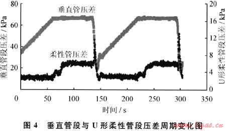 圖4是氣液相折算速度都為0.10m/s時U形柔性管段壓差和垂直管段壓差周期波動圖。由圖4可知,液塞在垂直管段生長時,垂直管段壓差逐漸增大,U形柔性管段壓差很小而且穩(wěn)定;液塞到達垂直管段頂部進入U形柔性管段后垂直管段壓差不變,U形柔性管段壓差開始增大,垂直管段壓差要遠大于U形柔性管段壓差,這主要是由于垂直管段的長度遠大于U形柔性管段的凈垂直高度。