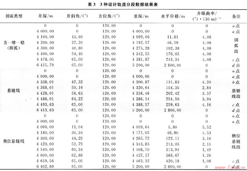 從表3可知,在設(shè)計(jì)井相同條件下,3種不同軌道具有幾何形狀特點(diǎn)如下:①設(shè)計(jì)井深以圓弧線最長(zhǎng)(6415.79m、65.00°),懸鏈線次之(6413.63m、65.00°),側(cè)位懸鏈線最短(6402.69m、65.00°),最大相差13m左右;②增斜段長(zhǎng)以側(cè)位懸鏈線最長(zhǎng)(659.56m、10.30%),懸鏈線次之(493.63m、7.70%),圓弧線最短(478.05m,7.45%);③最大井眼曲率以側(cè)位懸鏈線最大(5.52°/30m),懸鏈線次之(4.20°/30m),圓弧線最小(4.08°/30m)。