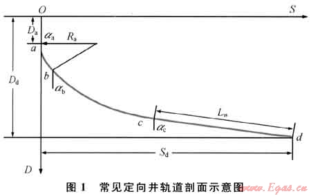 設(shè)計(jì)井眼軌道通常由4部分組成:oa段——直井段,ab——圓弧過(guò)渡段,bc段——特殊曲線井段(圓弧、懸鏈線或擬懸鏈線等),cd段——穩(wěn)斜井段(如圖1所示)。主要參數(shù)有:①靶點(diǎn)垂深Dd,水平位移Sd;②oa段:造斜點(diǎn)垂深Da,井斜角αa;③ab段:造斜率Ka或曲率半徑Ra;④cd段:穩(wěn)斜角αc、穩(wěn)斜段長(zhǎng)度Lw等[3]。