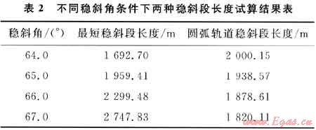 在確定合理的穩(wěn)斜角上,利用上述軌道設(shè)計(jì)方法對(duì)不同軌道進(jìn)行計(jì)算,設(shè)計(jì)出各種軌道對(duì)應(yīng)的關(guān)鍵參數(shù)、節(jié)點(diǎn)參數(shù)和分點(diǎn)數(shù)據(jù);然后從井眼長(zhǎng)度、最大狗腿度和增斜段長(zhǎng)等方面,對(duì)不同設(shè)計(jì)軌道進(jìn)行幾何形狀評(píng)價(jià)。
