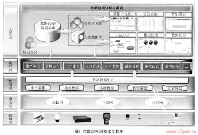 智能燃?xì)饩W(wǎng)是一個(gè)綜合的系統(tǒng)建設(shè)工程,它主要包括5個(gè)層次:物理感知層、網(wǎng)絡(luò)通訊層、共享數(shù)據(jù)層、運(yùn)營(yíng)執(zhí)行層、決策分析層。如圖2所示。