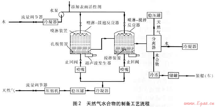 進入水合物反應器前,水和天然氣各自通過一條支路流動。天然氣由流量調節(jié)器控制流量,經(jīng)儀表測量工藝參數(shù)(如壓力、溫度、流量等參數(shù)),就地指示及遠傳至計算機控制系統(tǒng),經(jīng)壓縮機增壓至略高于反應壓力后進入穩(wěn)壓罐(維持水合反應時的壓力穩(wěn)定)。再經(jīng)儀表測量工藝參數(shù),經(jīng)冷凝器冷凝,分兩支路依次經(jīng)噴嘴和止回閥后,分別進入噴淋-鼓泡反應器和噴淋-攪拌反應器底部。