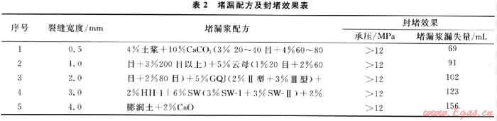 通過材料優(yōu)選確定以GQJ-Ⅱ型、GQJ-Ⅲ型為主要架橋材料,SW-Ⅰ、SW-Ⅱ為纖維材料,不同粒徑的CaC03和云母作為片狀填充材料,并配合高失水劑HH-1及無機鹽Ca0,根據(jù)Howard和Scott的SAN-2工程分布理論[11]確定了各種材料的粒徑級配,形成抗高溫堵漏配方,并用堵漏儀對0.5~4mm之間的縫板進(jìn)行承壓堵漏效果評價。試驗數(shù)據(jù)見表2,通過實驗數(shù)據(jù)可以看出,不同縫寬下承壓能力均高于12MPa。