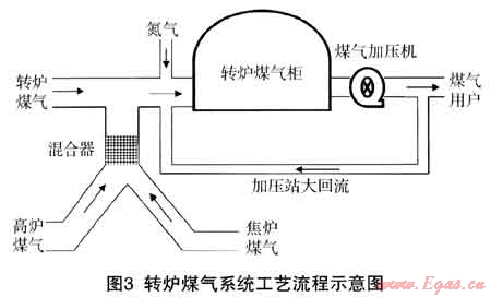 (2) 利用轉(zhuǎn)爐煤氣柜、煤氣加壓站、合成轉(zhuǎn)氣混合站等設(shè)施,在實(shí)際生產(chǎn)過(guò)程中町以實(shí)現(xiàn)焦?fàn)t煤氣和氮?dú)庵g的定量、均勻混合,合成后的混合氣可以通過(guò)加壓站供給用戶使用。