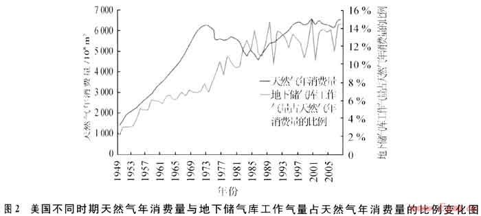 7) 市場對地下儲氣庫工作氣量需求會隨天然氣消費增長而持續(xù)增長,由于地下儲氣庫建設周期長,工作氣量的建設高峰期往往滯后于天然氣消費量高峰期。以美國為例,天然氣消費高峰期為1973年,天然氣年消費量達6000×108m3,但同期地下儲氣庫工作氣量僅200×108m3,不到天然氣年消費量的6%。但到了1990年前后,地下儲氣庫工作氣量就達到了1200×108m3左右,占天然氣年總消費量的15%。美國不同時期天然氣年消費量與地下儲氣庫工作氣量占天然氣年消費量的比例變化情況如圖2所示。