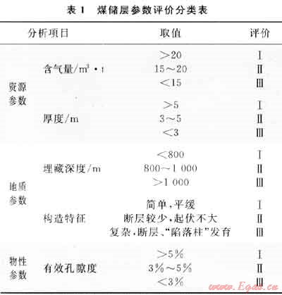 通過(guò)對(duì)煤儲(chǔ)層資源參數(shù)、地質(zhì)參數(shù)、儲(chǔ)層物性參數(shù)進(jìn)行評(píng)價(jià)和分類(表1),形成一套適合該區(qū)的煤儲(chǔ)層評(píng)價(jià)技術(shù)體系,并掌握了區(qū)內(nèi)含氣量分布特征(一般介于15~25m3/t,平均為20.2m3/t,66%的井含氣量大于20m3/t),劃分出3個(gè)Ⅰ類建產(chǎn)區(qū)、4個(gè)Ⅱ類建產(chǎn)區(qū)、4個(gè)Ⅲ類建產(chǎn)區(qū),為產(chǎn)能建設(shè)提供了有利區(qū)塊。