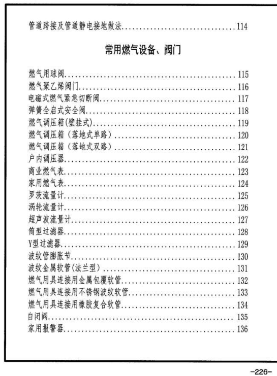 3.10本圖集“常用燃?xì)庠O(shè)備、閥門(mén)”列示了常用閥門(mén)、調(diào)壓箱、計(jì)量表等,根據(jù)最新國(guó)家規(guī)范的要求,增加了燃?xì)庥镁哌B接用不銹鋼波紋管、燃?xì)廨斔陀貌讳P鋼波紋管,自閉閥等國(guó)家規(guī)范要求或推薦使用的材料。由于市場(chǎng)上燃具和用氣設(shè)備種類(lèi)繁多、更新?lián)Q代較快,故取消了原燃具和用氣設(shè)備圖示。